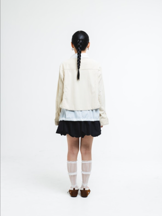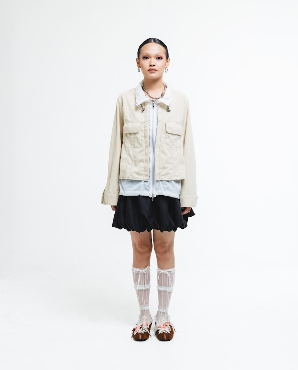 double-layered fabrics fused into one, a textural contrast of cotton and parachute, and an adjustable hem you can cinch for structure. The unique collar and front zipper make it both functional and fashion-forward, a new definition of polished edge.