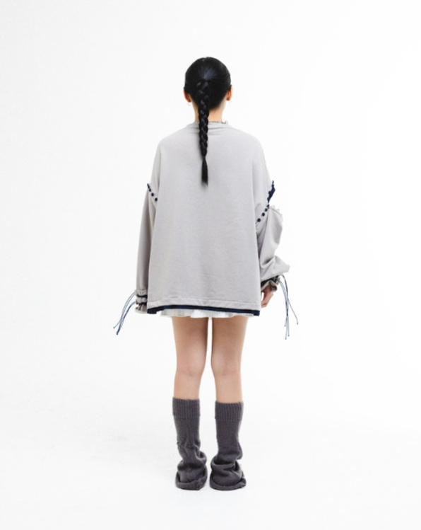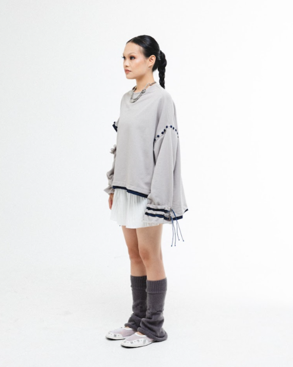 A sweater that transforms with your day. Its sleeves can be detached or ruched with adjustable ties, allowing you to style it your way. Asymmetrical hems add movement, while its oversized silhouette keeps it effortlessly bold, the perfect mix of comfort and statement.